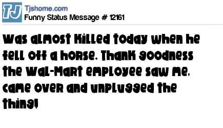 - # 9347 almost killed today when he fell off a horse. Thank god the walmart employee saw me, came over and unplugged the thing