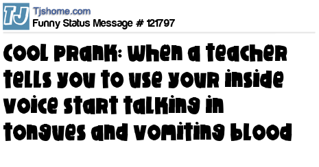 X  Cool prank: when a teacher tells you to use your inside voice start talking in tongues and vomiting blood