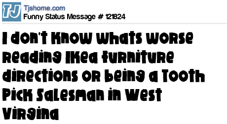X I don't know whats worse reading Ikea furniture directions or being a Tooth Pick Salesman in West Virgina