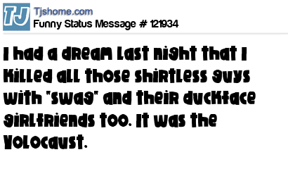 X I had a dream last night that I killed all those shirtless guys with "swag" and their duckface girlfriends too. It was the Yolocaust.