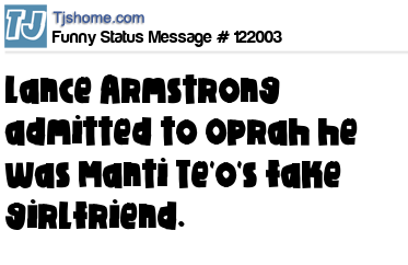 - # 122180 I don't think Lance Armstrong's missing ball was ever real... I heard it and Manti Te'o's girlfriend were recently seen on vacation together in Mexico...