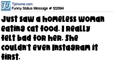 X says Just saw a homeless woman eating cat food. I really felt bad for her. She couldn't even Instagram it first.