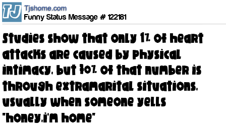X studies show that only 1% of heart attacks are caused by physical intimacy, but 70% of that number is through extramarital situations, usually when someone yells "honey,i'm home"