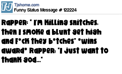 X is Rapper: " I'm killing snitches, then I smoke a blunt get high and F*ck they b*tches" *wins award* Rapper; "I just want to thank god..."