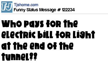 - # 210947 Just got my electricity bill and I believe I got charged for the sunlight, the moonlight, the street light, the light of my life, the speed of light, and the light at the end of the tunnel.