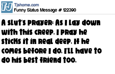 X A slut's prayer: As I lay down with this creep, I pray he sticks it in real deep, If he comes before I do, I'll have to do his best friend too.