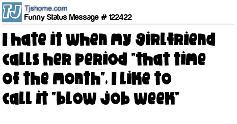 X I hate it when my girlfriend calls her period "that time of the month", I like to call it "blow job week"
