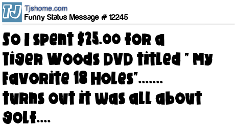 - # 182745 Just got scammed out of $15. Bought Tiger Woods DVD entitled "My Favorite 18 Holes." Turns out it's about golf. Absolute waste of money.
