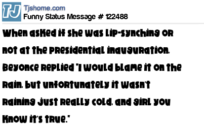 X says When asked if she was lip-synching or not at the presidential inauguration, Beyonce replied "I would blame it on the rain, but unfortunately it wasn't raining just really cold, and girl you know it's true."