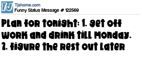 X is Plan for tonight: 1. get off work and drink till Monday. 2. figure the rest out later