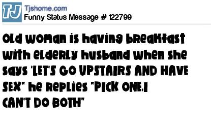 X old woman is having breakfast with elderly husband when she says 'LET'S GO UPSTAIRS AND HAVE SEX" he replies "PICK ONE,I CAN'T DO BOTH"