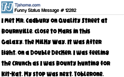 X I met Mr. Cadbury on Quality Street at Bournville, close to Mars in this Galaxy, the Milky Way. It was After Eight, on a Double Decker, I was feeling the Crunch as I was Bounty hunting for Kit-Kat. My stop was next, Toblerone.