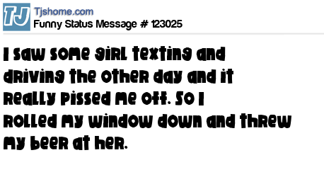 - # 118891 I saw some girl texting and driving the other day and it really pissed me off. So I rolled down my window and threw my beer at her.