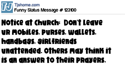 - # 79967 Notice seen outside a Church: Please do not leave your Purse/Watch/Handbag/Mobile/Girlfriend/Boyfriend unattended. Others may think it`s an answer to their prayers.
