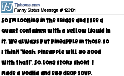 X is So I'm looking in the fridge and I see a quart container with a yellow liquid in it. We always put pineapple in those, so I think "Yeah, pineapple will go good with that!". So, long story short, I made a vodka and egg drop soup.