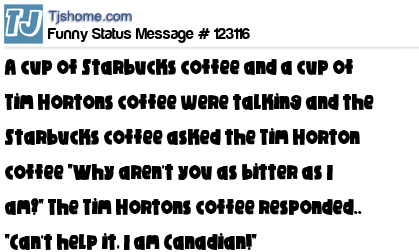 X says a cup of Starbucks coffee and a cup of Tim Hortons coffee were talking and the Starbucks coffee asked the Tim Horton coffee "Why aren't you as bitter as I am?" The Tim Hortons coffee responded.. "Can't help it, I am Canadian!"