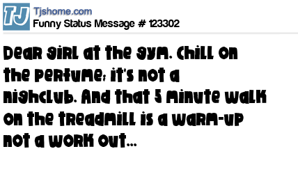 X says Dear girl at the gym. Chill on the perfume; it's not a nighclub. And that 5 minute walk on the treadmill is a warm-up not a work out...