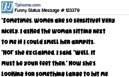 X "Sometimes, women are so sensitive! Very nicely, I asked the woman sitting next to me if I could smell her armpits. "NO!" she exclaimed. I said, "Well, it must be your feet then." Now she's looking for something large to hit me with ツ