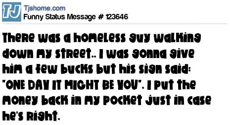 - # 186050 There was a homeless man I was going to give a dollar to untill I read the sign he was holding that read "One day this could be you." So I put the dollar back in my pocket in case he may be right.