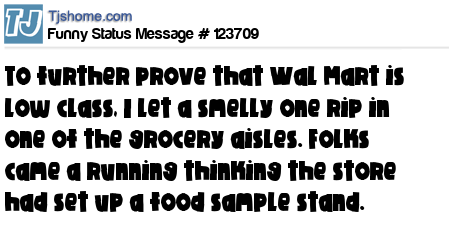 - # 123716 To further prove that Wal Mart is low class, I let a smelly one rip in one of the grocery aisles. Folks came a running thinking the store had set up a food sample stand. Unrelated, never trust a fart.