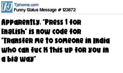 X says Apparently, "Press 1 for English" is now code for "Transfer me to someone in India who can fuc k this up for you in a big way"