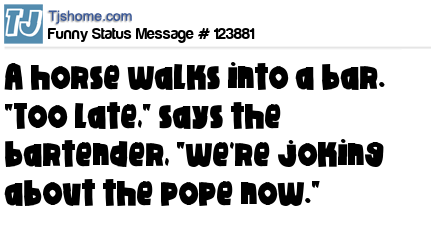 X is A horse walks into a bar. "Too late," says the bartender, "we're joking about the pope now."