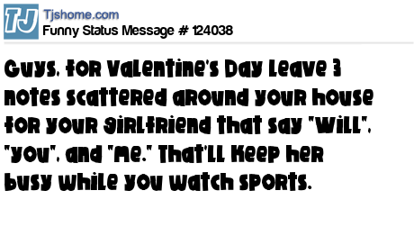 X Guys, for Valentine's Day leave 3 notes scattered around your house for your girlfriend that say "Will", "you", and "me." That'll keep her busy while you watch sports.