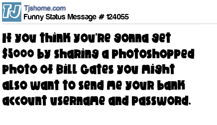 X If you think you're gonna get $5000 by sharing a photoshopped photo of Bill Gates you might also want to send me your bank account username and password.