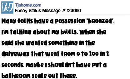 X Many folks have a possession "bronzed". I'm talking about my b@lls. When she said she wanted something in the driveway that went from 0 to 200 in 2 seconds, maybe I shouldn't have put a bathroom scale out there.