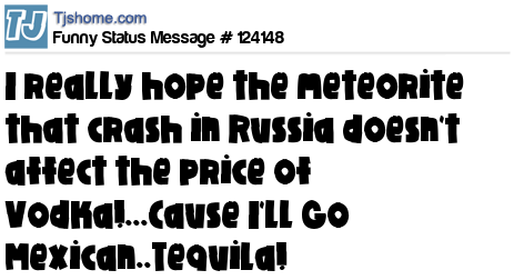 X I really hope the meteorite that crash in Russia doesn't affect the price of Vodka!...Cause I'll Go Mexican..Tequila!