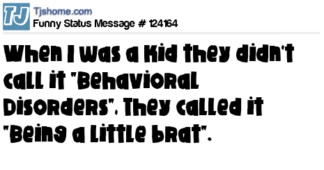 - # 126904 When I was a kid they didn't call it "Behavioral Disorders", They called it "A Brat about to get an a$s whooping".