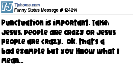 X says punctuation is important. Take; Jesus, people are crazy or Jesus people are crazy. OK, that's a bad example but you know what I mean...