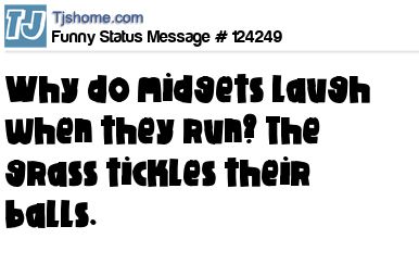 - # 141248 My son just told me a joke. So here it is, tell me what you think. Why do midgets laugh when they run?? Cause the grass tickles their balls.