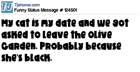X says My cat is my date and we got asked to leave the Olive Garden. Probably because she's black.