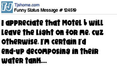 X is I appreciate that Motel 6 will leave the light on for me, cuz otherwise, I'm certain I'd end-up decomposing in their water tank....