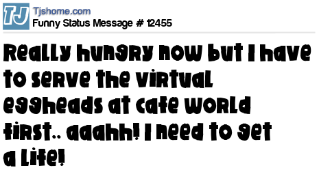 X is really hungry now but I have to serve the virtual eggheads at cafe world first.. aaahh! I need to get a life!