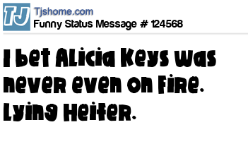 - # 123391 Jesus, Alicia Keys! Are you just going to stand there singing about it, or are you going to help the poor girl?!? GET A BUCKET OF WATER THIS GIRL IS ON FIRE!