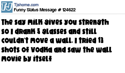 - # 64689 They say milk gives you strength. Drink 3 glasses and move a wall. You can't. But drink 3 shots of vodka and see - the wall moves on its own! :p =D