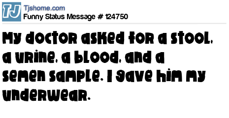 - # 174378 My doctor needed a stool, a ur-ine, a se-men and a blood sample. I gave him my underwear.