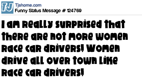 - # 183911 I am really not surprised that there are not many women race car drivers, Women drive all over town like race car drivers anyway