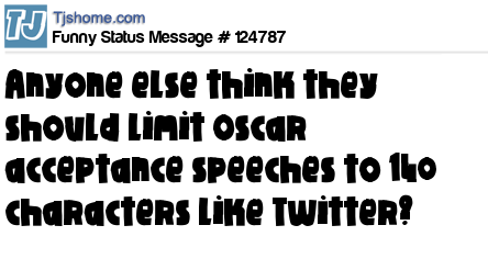- # 16376 thinks that, instead of 45 secs, they should limit tonight's Oscar acceptance speeches to the same as Twitter, 140 characters!!