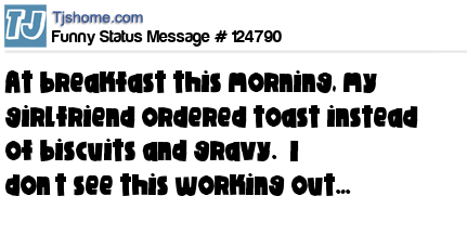X says at breakfast this morning, my girlfriend ordered toast instead of biscuits and gravy. I don’t see this working out…