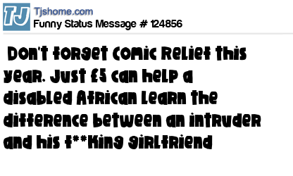 X Don't forget Comic Relief this year. Just £5 can help a disabled African learn the difference between an intruder and his f**king girlfriend