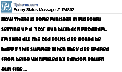 X is Now there is some minister in Missouri setting up a "toy" gun buyback program.. I'm sure all the old folks are gonna be happy this summer when they are spared from being victimized by random squirt gun fire....