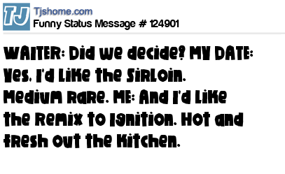 X says WAITER: Did we decide? MY DATE: Yes, I'd like the Sirloin. Medium rare. ME: And I'd like the Remix to Ignition. Hot and fresh out the kitchen.