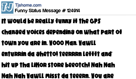 X It would be really funny if the GPS changed voices depending on what part of town you are in. YOOO Man, Yawll enturrin da ghetto! teerrrn leffft and' hit up tha likor store beeotch! Nah Nah Nah Nah Yawll misst da teeern. You are reallly dumm. Fur reel.