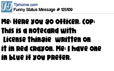 X says Me: Here you go officer. Cop: This is a notecard with “License thingie” written on it in red crayon. Me: I have one in blue if you prefer.