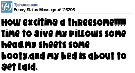 X How exciting a threesome!!!! Time to give my pillows some head,my sheets some booty,and my bed is about to get laid.