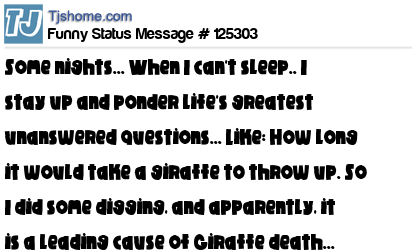 X Some nights... When I can't sleep.. I stay up and ponder life's greatest unanswered questions... Like: How long it would take a giraffe to throw up. So I did some digging, and apparently, it is a leading cause of Giraffe death... And now I'm sad. :(