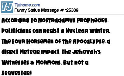 X According to Nostradamus Prophecies, Politicians can resist a Nuclear Winter, The Four Horsemen of the Apocalypse, a direct Meteor Impact, the Jehovah's Witnesses & Mormons. But not a Sequester!
